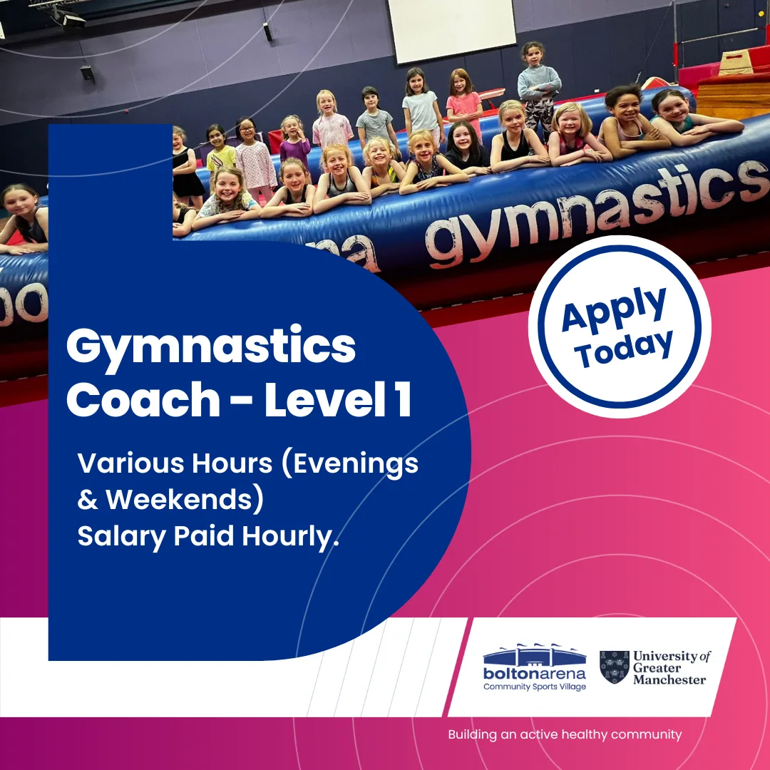 Bolton Arena requires gymnastics coaches to join its growing programme. The successful applicant will be responsible for delivering in the evening and weekends to children aged 5-15. We are looking for coaches who are enthusiastic, motivated and focused on developing potential athletes.